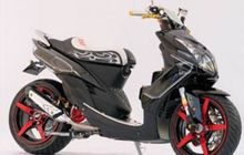 Andre Wiguna usung konsep bobber di Yamaha Mio Soul miliknya. Terlihat dari pemakaian pelek lebar yang terpasang rapi di skubek berkelir hitam ini.