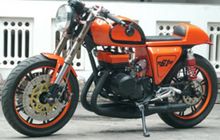 Lewat kelir oranye kombinasi striping hitam, Suzuki GT 185 ini bikin ngiler penggemar modifikasi cafe racer. Apalagi, sport Suzuki 2-tak 185 cc dua silinder ini, cukup ngetop di zamannya.