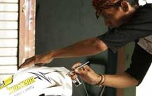 Anda bosan dengan tampilan desain striping motor Anda? Datang saja ke Mega Art yang dikomandani langsung oleh Ahmad Rafiq, sekaligus pemilik gerai Mega Art.