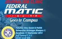 Gelaran Journalism Clinic Federal Matic Goes to Campus segera berlanjut. Kali ini akan menyambangi Universitas Airlangga (Kampus B) Surabaya, Jawa Timur, setelah sebelumnya diadakan di Kampus Universitas Padjajaran (UNPAD) Bandung, Jawa Barat.