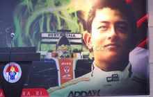 Ada yang unik dalam pembukaan acara 'Solidaritas Merah Putih Untuk Rio Haryanto' yang digelar di kantor Kementerian Pemuda dan Olahraga (Kemenpora) di Jakarta, Senin (7/3). Dalam banner yang terpasang, terpampang logo kemenpora di moncong MRT05, mobi