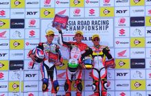 Si Bonex Boy mengibarkan bendera Merah Putih di podium race pertama AP250 di putaran ketiga Asia Road Racing Championship tahun ini, Gerry Salim kalahkan joki tuan rumah