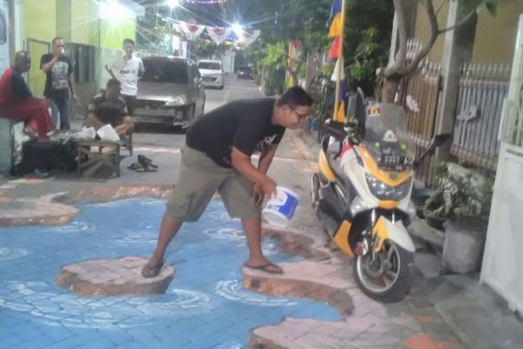 Firman Ardiansyah bersama warga menciptakan karya luar biasa dengan membuat lukisan sungai berbentuk 3D di depan rumahnya di Pondok Permata Suci, Gresik.
