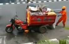 Sebuah motor roda tiga pengangkut sampah milik dinas lingkungan hidup DKI Jakarta dilahap api kemarin (18/01/2018).