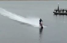 Enggak usah tunggu ada motor super canggih yang bisa terbang dan bisa berenang. Motor standar pun bisa berjalan di atas air kok.