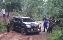 Sebuah Toyota Fortuner melewati sebuah trek off-road dengan medan berlumpur yang licin. Mobil dengan pelat nomor dinas polisi tersebut tergelincir