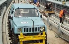 Sebuah Suzuki Jimny lawas berwarna biru muda yang dipakai untuk mencoba rel kereta MRT di Palembang, Sumatra Selatan