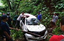 Daihatsu Xenia berpenumpang sembilan orang ringsek setelah terjun ke jurang. Akibat kecelakaan ini seorang anak kecil berusia 10 tahun tewas