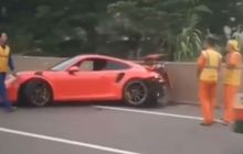 Sebuah sportcar Porsche 911 GT3 RS hancur di buritan akibat menampar beton pembatas jalan tol, akibatnya
