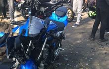 Kecelakaan adu wajah saling tampar melibatkan dua Suzuki GSX-R150 beda warna, kondisi fairing hancur terkoyak, batang sokbreker melengkung
