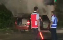 Sebuah Mitsubishi Chariot mengepul asap hitam dari area mesin, api menjilat menyala terang sampai ke dasbor