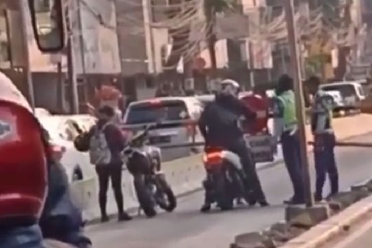 Pemotor Yamaha NMAX dan trail hitam terobos jalur bus Transjakarta, ngotot pengin buka portal, adu mulut lawan petugas