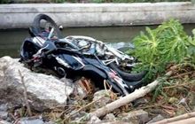 Kawasaki Ninja 150 R warna hitam tergelatak di sebelah sungai setelah diduga terlibat kecelakaan tunggal. Oleng diduga jadi penyebab utama