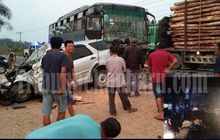Daihatsu Terios hancur, wajah dan ruang mesin terbelah, diseret bus hingga hantam truk berhenti, Leonardo Dicaprio tewas dari kabin Terios