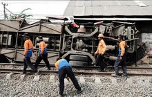 Bus PO Agra Mas terguling parah usai terseret kereta api di Karawang Timur karena mogok di atas rel, bodi terkelupas