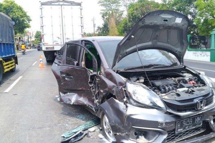 Sebuah Honda Brio rusak parah setelah adu senggol dengan truk boks. bermula Brio menyalip truk dsri sisi kiri