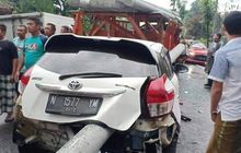 Toyota Yaris berlubang sampai tembus ke bagasi belakang. Dikarenakan tiang beton melorot dari sebuah truk