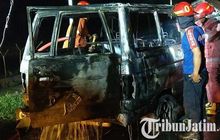 Toyota Kijang kotak ludes terbakar yang berawal dari nyala lilin si anak yang dibawa masuk ke dalam kabin hingga membesar di Trenggalek