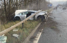 Lamborghini Gallardo yang dikemudikan kiper Manchester United, Sergio Romero ringsek, terpelanting hajar pembatas jalan
