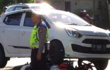 Yamaha V-Ixion rusak setelah dilindas Daihatsu Ayla dari belakang. Namun untung bagi pemotor berhasil lolos setelah loncat