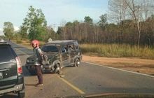 Toyota Kijang Krista mengalami laka tunggal di kabupaten Bintan hingga melintang dan porak-poranda, empat roda meletus
