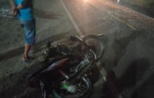 Honda Supra Fit tergeletak di jalan dengan kondisi terpotong, setang dan sasis terpisah adu banteng lawan truk