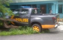 Isuzu D-Max Satuan Sabhara Polres Kepulauan Meranti, Riau nampak nyeruduk pagar rumah. Kejadian ini lantara petugas menghindari emak-emak