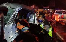 Suzuki New Carry ringsek hingga kabin tertekuk dan atap terlipat setelah terjang pohon di Jalan Raya Kadugede, Kuningan, Jabar hingga penumpang tewas