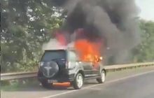 Sebuah Toyota Rush hangus terbakar di pinggir jalan tol setelah diduga ada korsleting pada fitur pemantik roko