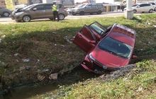 Daihatsu Xenia anjlok ke parit setelah beradu lawan Suzuki Ertiga hingga mengalami kerusakan pada bodi depan.