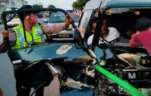 Mitsubishi L300 remuk setelah beradu kencang lawan sebuah truk. Evakuasi pengemudi terjepit sampai bawa derek