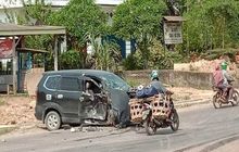 Toyota Avanza rompal di bodi dan kaki-kaki ambyar hingga melintir usai ditabrak truk LPG Pertamina di Sungai Lilin, Musi Banyuasin, Sumsel