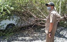 Toyota Calya tertutup ranting dan batang pohon yang tercabut sampai ke akar ulah truk tronton maksa masuk jalan sempit