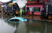 Toyota Vios Limo Blue Bird Nyemplung ke Kali, Separuh Tenggelam, Jalan dan Sungai Rata Air