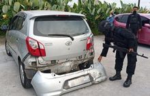 Sebuah Toyota Agya copot bumper belakangnya setelah ditubruk rombongan kendaraan milik Brimob. 6 anggota brimob terluka