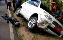 Daihatsu Terios pelat merah nyungsep parit usai disleding tekel Honda CB150R makan jalan, pengendara terkapar masuk kolong