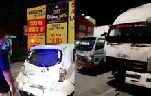 Nissan March, Honda MegaPro dan truk box disosor keras truk tronton saat berhenti di lampu merah Exit tol Ngasem, Karanganyar