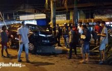 Toyota Avanza nangkring di atas taman pembatas jalan, dua pohon masuk kolong, alibi pengemudi hindari orang nyeberang, di kabin bawa anjing