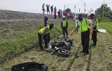 Honda BeAT hancur tak berbentuk hingga sasis melengkung serta bodi berceceran usai ditebas kereta api Matarmaja di Kediri