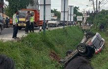 Sebuah Honda HR-V masuk selokan setelah terlibat kecelakaan dengan truk bermuatan pasir. Sampai saat ini polisi masih melakukan olah tempat kejadian