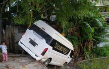 Toyota Hiace terjungkal ke sawah saat melaju di jalan raya Banda Aceh-Medan, posisi nungging, untung jalanan masih sepi