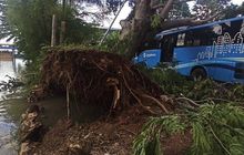 Bus Transjakarta jurusan Kampung Melayu-Ancol tertimpa pohon ambruk yang tercabut sampai akar di Halte Ancol, beruntung posisi kosongan