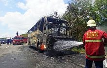 Bus Pariwisata yang angkut 59 orang peziarah hangus terbakar dan bersisa rangka. Berawal bau hangus hinga api membesar