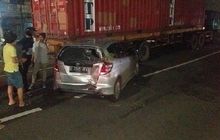 Honda Jazz nyangkut di bak truk trailer mogok, bumper sampai fender kiri depan terkoyak, dari belakang masih disambar Yamaha Jupiter Z