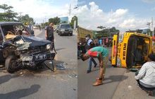 Toyota Kijang terjang truk tangki dari berlawanan arah saat buru-buru ke rumah sakit hingga bodi terburai serta roda patah di Indralaya, Ogan Ilir