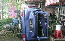 Suzuki Carry rusak parah setelah digebrak pohon tumbang saat melaju. Bahkan mobil sampai terlempar ke trotoar