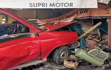 Isuzu Panther angkot terjang sebuah bengkel motor di Jl Dr. KRT Radjiman Widyodiningrat, Cakung, Jakarta Timur, barang-barang berantakan