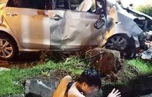 Toyota Yaris yang dikemudikan seorang pemuda rusak parah setelah tabrak tiang PJU dan trotoar. Berawal ngebut dan berakhir oleng