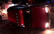 KIA Sportage berakhir rebahan di tengah jalan setelah terpelanting menghantam pembatas jalan. Pengemudi meregang nyawa