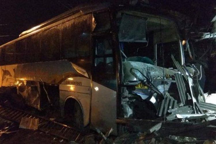 Bus PO Sugeng Rahayu remuk, menganga depan terjang rumah warga kecepatan tinggi di Trowulang, Mojokerto, Jawa Timur